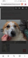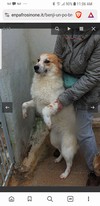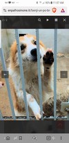 Lui è molto bello, sembra un po' una volpe e un po' un breton , bianco e arancio con il pelo soffice. Ha conservato l'espressione tenera e speranzosa dei cuccioli. Dalle sbarre del suo box quando ci avviciniamo ci lecca le mani e tende le sue zampe fra le grate come per raggiungerci, con occhi dolci e imploranti. Quando entriamo nel suo box si alza sulle zampe per abbracciarci, è buono, gentile, cerca il contatto umano e ci sorride, felice per quei pochi momenti di gioia. Quando usciamo dal box allora uggiola come un cucciolo, per richiamarci.