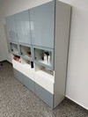 Vendo armadio modello Besta Ikea, bianco e blu/grigio chiaro, con vetrine e cassetti, a 3 ante, per salotto o camera.